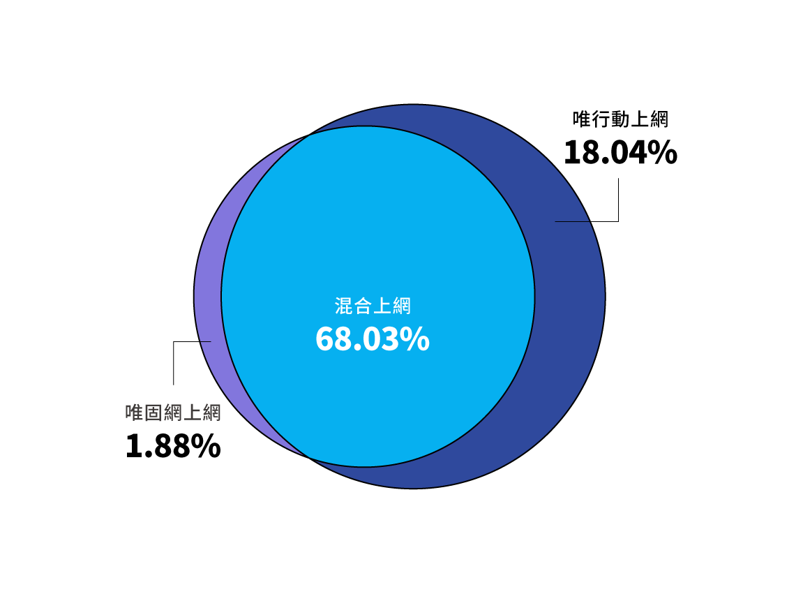 - 我國唯行動上網普及率為18.04%、唯固網上網普及率則為1.88%,相較於去年皆有略微下降。而混合上網普及率為68.03%,則較去年63.00%有明顯上升。
