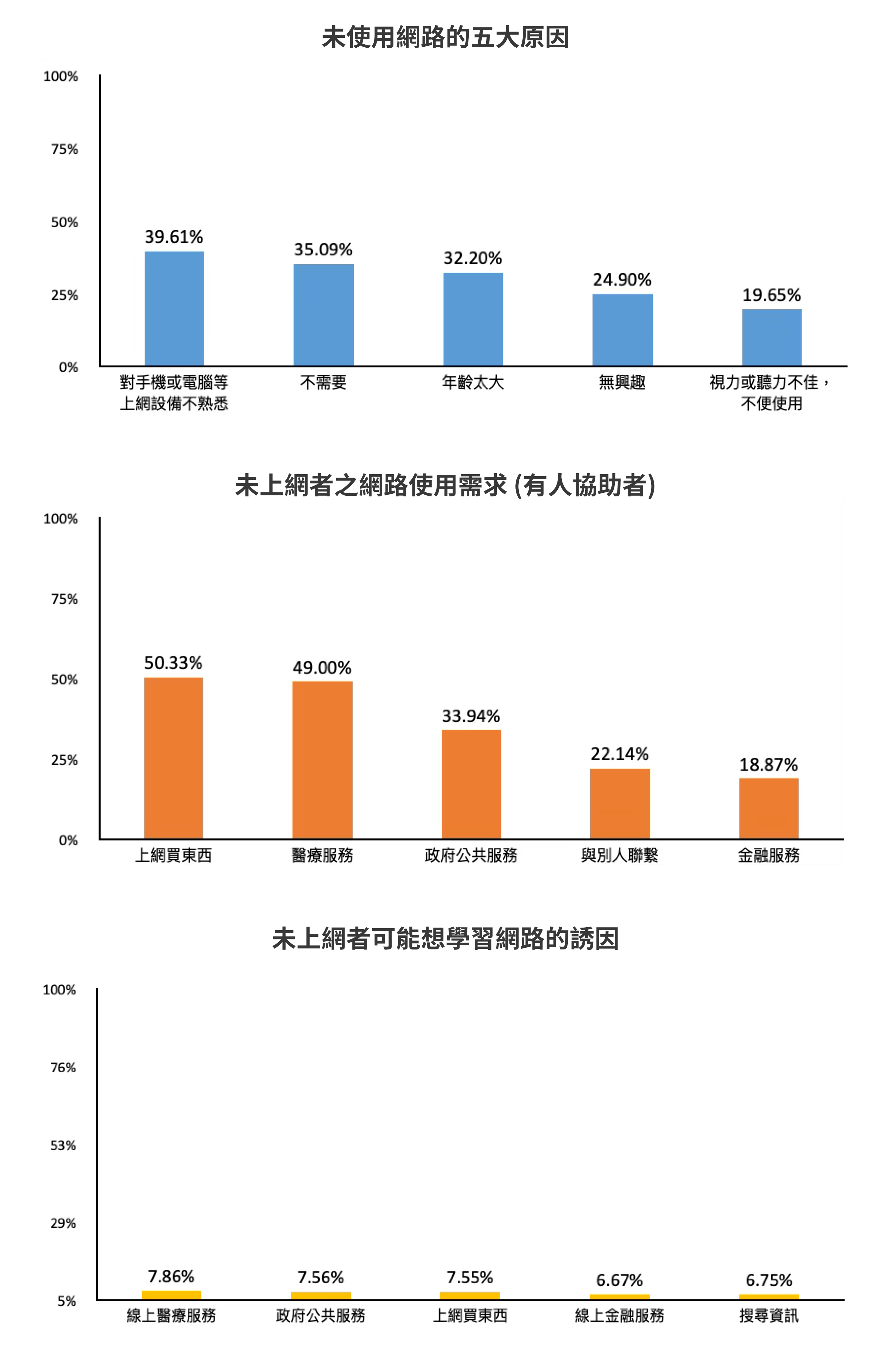 - 第二層數位落差,延續第一層數位落差的上網能力差距情況,亦以年齡70歲及以上、小學及以下學歷族群,應用服務使用率明顯低於其他族群。