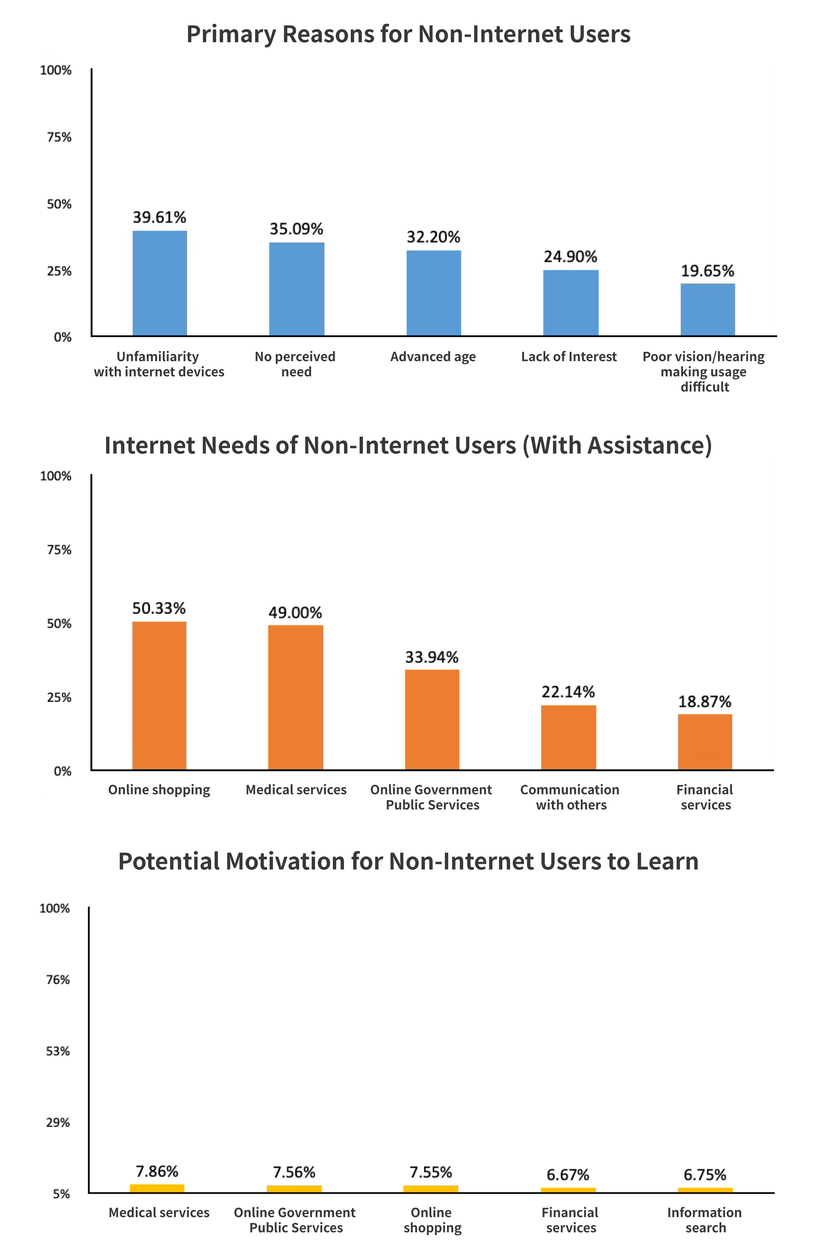 - The first-level digital divide often occurs due to disparities in internet access capabilities caused by age and educational level. Among these, the population aged 70 and above and those with elementary school education or below have relatively disadvantaged internet access rates. Data from residential areas also shows that internet usage rates among residents in the Yilan-Hualien-Taitung region are relatively lower than other regions.